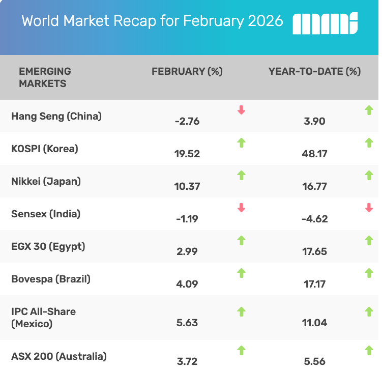 Markets outside of Europe also gained in February. Mexico (+5.63 percent) was one of the top performers. India was under pressure, falling 1.19 percent. 13