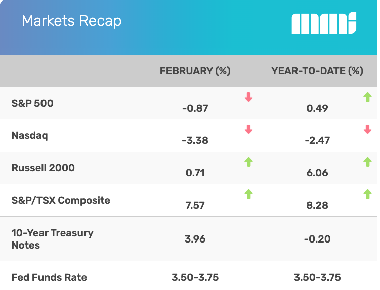 U.S. stocks struggled in February amid fears that artificial intelligence would disrupt a wide swath of industries, unsettling investors. Late in the month, geopolitical concerns weighed on the market amid tensions in the Middle East.